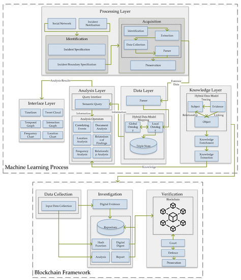 NLP techniques are applied to analyze the collected dataset from every aspect to provide meaningful information to the proposed system. This process has five main layers: a processing layer, an interface layer, an analysis layer, a data layer, and a knowledge layer. The responsibility of the processing layer is to identify and acquire the system input. Inputs are from social networks and incident notifications for which identification requires the incident specification and incident boundary specification. The identification, extraction, data collection, the parser, and preservation are required before moving forward to acquisition. Completing this process, the forensic data is the input of the data layer. In this layer, the hybrid data mapping is used for global and local ontology and storing the data. The next layer is the analysis layer for which the interface query is an NLP semantic interface, and the analysis operators are correlation events and document analysis, location analysis, the relatedness of findings, frequency analysis, and relationship analysis. The analysis report moves to the interface layer, which contains the timelines, tweet cloud, temporal graph, interaction graph, frequency chart, and location chart. Next is the knowledge layer, where the relationship between the extracted dataset and its linking is processed. After completing the NLP steps and data processing, the analyzed dataset is ready to save into the blockchain framework. The main reason for using the blockchain framework is to secure the collected dataset with limited access to avoid hacking or attack. The blockchain framework contains the data collection, investigation, and verification processes, which provides the verified data to a court for defense and prosecution.