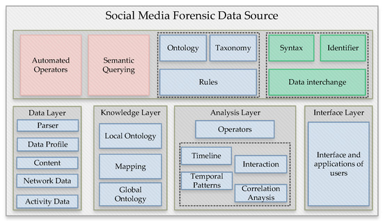 The presented knowledge model is an event-based system that prepares the social media analysis based on electronic forensics. The ontology technique is applied for representing the related knowledge of OSNs. The detailed explanations show the automated method process and provide formal information through ontologies for the true validation and automated techniques. The investigation of forensic models is from the collection of semi-automated processes. This model contribution provides the boundary identification of data collection from the social media distribution network. The model gives the limitations of forensic data in terms of appropriate parameters and automated collection. Figure 2 describes the details of every layer for the forensic data-analysis process: the automated operators, semantic querying, the rules of the ontology and taxonomy processes, and the identification of the data interchange regarding the defined layers processed for analysis of forensic data system. The data layer contains the parser, the data profile, the content, the data from the network, and activity data. The knowledge layer contains the local/global ontology process and mapping details. The analysis layer gives the information and further processes the operators, timeline, interaction, temporal patterns, and correlation analysis, and finally, the interface layer shows the user applications and interfaces.