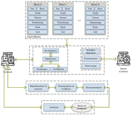 There are three main processes defined for the DF investigation: applying a smart contract to perform the evidence analysis automatically, e.g., email analysis, signature or file analysis, etc, and providing better auditability by improving the investigation transparency, thereby reducing the costs and used resources and increasing connection stability between third parties.