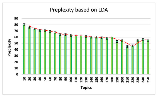 Figure 5 shows the perplexity records achieved from LDA and records 210 out of the 250 tested topics. Regarding this process, the data was vectorized for the 210 topics. In Figure 5, the x-axis presents the number of topics extracted from this process and the y-axis presents the perplexity of each topic category.