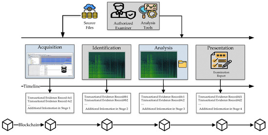 Figure 8 presents the details of using blockchain in forensic analysis. There are four main sections, namely, data acquisition, identification, analysis, and presentation. Regarding the timeline, the transactional evidence record is in the blockchain framework. In data acquisition section, all the related information is saved in the blockchain. In the identification section, suspicious files are saved in the blockchain too. In the analysis stage, by using the hash function, various file types are analyzed and stored in blockchain. The presentation stage writes all the reports and findings to the blockchain.