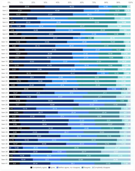 Figure 1 shows the distribution of responses (degree of agreement/disagreement) for each of the items of the proposed questionnaire. A high degree of agreement stands out with items 1 and 9 (more than 70% agreed or totally agreed), 2 (more than 60% agreed or totally agreed), and 30 and 31 (in these last two, about 50% agreed or strongly agreed). There was also a high percentage of participants who say they agreed or totally disagreed with items 38, 39, and 40 (52.74%, 52.05%, and 57.54% respectively).