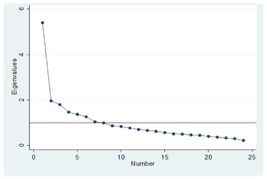 Figure 2 below, the sedimentation graph, shows the optimization result with the 24 items included. The optimal number of factors in this case was 7–8 factors. This means that the first 7–8 factors had variances (eigenvalues) greater than 1. The eigenvalues changed less markedly when more than 7–8 factors were used. Therefore, 7–8 factors seemed to explain most of the variability in our data. The sedimentation plot shows that the first seven factors explained most of the total variability in the data. The remaining factors represented a very small proportion of the variability and are probably not as important.