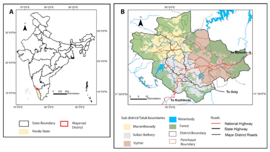 Figure 1A shows the geographical location of the state of Kerala and Wayanad District in the map of India. Wayanad district covers an area of 2120 sq. km and 40% of its area is covered by forests. Forest cover has become absent from the central part (Figure 1B). The district is subdivided into three sub districts namely, Mananthawady, Sultan Bathery and Vythiri (Figure 1B). The subdistricts are further divided into 26 g panchayats (rural administrative boundary) (Figure 1B). Wayanad is the least populated district of Kerala, with a total population of 817,420 [38], which is 2.45% of the total population of the state. It is the less urbanized district, with a very high rural population and with the highest percentage of state forest dwellers (26%).