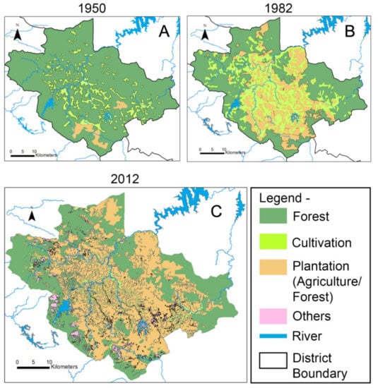 The main cause of the loss of forest cover between 1982 and 2012 is forest fires. There were 316 fire incidents, mainly due to human-induced causes, in the Wayanad Wildlife Sanctuary between 2001 and 2011 [54]. As a result, the forest cover has been reduced by 2012 (Figure 2C). The decrease in cultivation from 1982 to 2012 happened as the multi-cropping pattern is replaced by mono-cropping/plantation-type cultivation (Figure 2B,C). In summary, there has been a ~51% decrease in forest cover occurred during 1950–2012. Whereas a ~1329% increase in plantation cover occurred during the same time (Table 1).