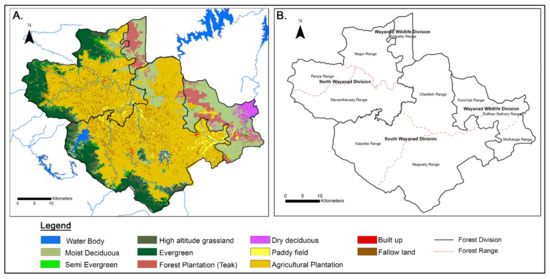 (A) Detailed LULC of Wayanad district of 2018 showing forest and agricultural plantations. (B) Forest divisions and ranges in Wayanad district.