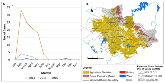 Another reason for KFD outbreak is the encroachment of forest area. Encroachment inside the wildlife divisions is the constant concern of authorities (Kerala Forest Statistics, 2018). Tribes are most vulnerable to KFD infected ticks because of their forest dependent livelihood [46]. High abundance of Haemaphysalis spinigera tick species has been reported from the forest floor of Wayanad district in 2015 [46,48]. Most of the victims of this disease are from tribal areas, and all the reported deaths occurred among tribal people in 2015 [48]. However, the accurate number of cases is not reported for KFD at many times, and as a result, the number of cases remains underreported for KFD (Figure 4A).