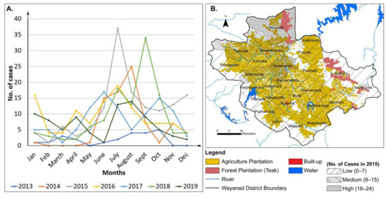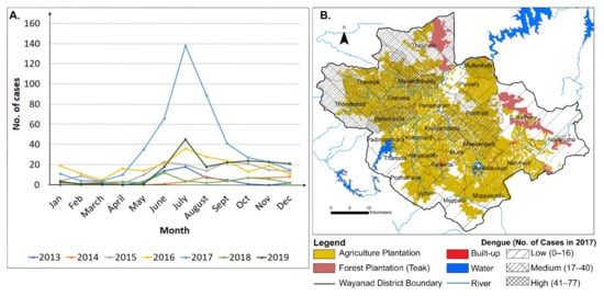 (A) Month wise dengue cases in Wayanad district for the time 2013–2019, and (B) thematic map showing Gram Panchayat wise dengue cases in 2017 superimposed on plantation map.