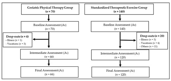 Sample size was calculated based on the detection of a minimal clinical important difference (MCID) in a minimum of 3 points in the Spanish version of the Short Form-36 version 2 Health Survey (SF-36v2) for measuring HRQoL [39,40,41], and a minimum 2 cm reduction in pain intensity measured with the Visual Analogue Scale (VAS) [42,43]. Therefore, the subjects who met the inclusion criteria were consecutively included in the study: 70 participants in the Geriatric Physical Therapy group (GPTG); and 140 individuals in the Standardized Therapeutic Exercise group (STEG). Since the STEG intervention was shorter, in order to minimize risk of bias, estimating a standardized mean difference of 0.4, with a significance level of 5% and a power of 80%, there were 2 people assigned to the STEG for each subject assigned to the GPTG.