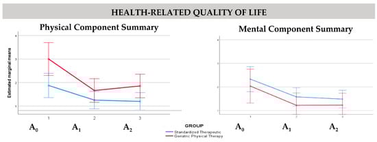 Regarding HRQoL, PCS values showed an association with age (p = 0.02) and BMI (p = 0.02) outcomes, while MCS values showed an association with sex (p = 0.04). Group intervention was not statistically significant—neither PCS nor MCS (p = 0.13 and p = 0.75, respectively). Figure 2 shows the estimated marginal means for HRQoL (PCS and MCS values) at baseline (A0), post-intervention (A1), and final (A2) assessments by intervention groups.