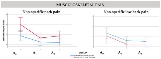 In relation to musculoskeletal pain, non-specific neck pain values showed an association with the intervention (p = 0.04), while non-specific low back pain values did not show an association with any other variables (p > 0.05). Figure 3 shows the estimated marginal means of musculoskeletal pain (non-specific neck pain and non-specific low back pain) at baseline (A0), post-intervention (A1), and final (A2) assessments by intervention groups.
