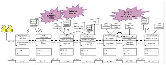 As of that moment, the researchers monitored and observed all the steps taken by the patient, from their admission to the unit to their departure or hospitalization. A characterization form was applied, which addressed data such as age, sex, classification, specialty, and patient outcome. During the observation of the patient’s journey, the following times were timed according to the Lean methodology [11,12]: