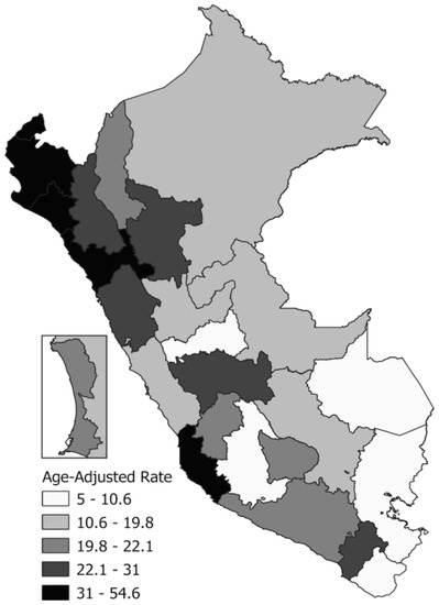 The IHD mortality results, according to the administrative regions of Peru, showed a decrease in the age-adjusted IHD mortality rates during the study period (Table 3). In 2017, coastal regions such as Lambayeque (54.6), Tumbes (50.4), Piura (44.9), and Ica (39.8) represented the highest age-adjusted IHD mortality rates. On the other hand, the administrative Andean regions represented the lowest rates (Figure 1).