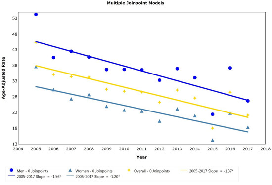 Joinpoint analysis for ischemic heart disease mortality rates adjusted for age (per 100,000) in Peru from 2005 to 2017. * p < 0.05. A trend analysis was performed with a joinpoint regression model using Joinpoint Trend Analysis software v4.8.0.1. The Grid Search method was used as well as the Bayesian information criterion to determine the optimal model. To calculate age-adjusted mortality rates, the direct method was used with the World Health Organization population standard [18].