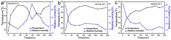 The changes in temperature and relative humidity in sunny conditions inside the vehicles of (a) A1-1, (b) A2-1 and (c) A3-1 during enclosure and air sampling.