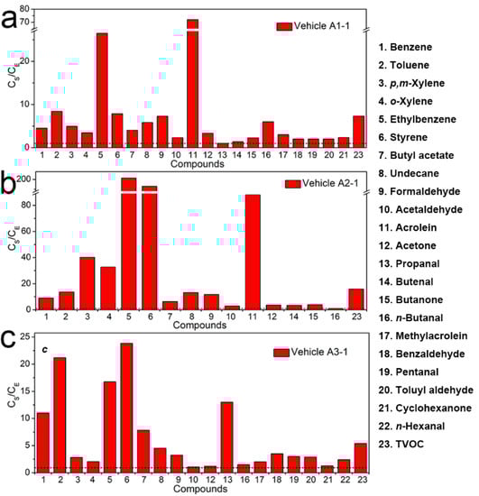 The ratios of concentrations of confirmed compounds and TVOC measured inside the (a) Vehicle A1-1, (b) Vehicle A2-1, (c) Vehicle A3-1 in sunshine condition (CS) to that in the environment test chamber (CE). The black short dash corresponds to a value of 1.