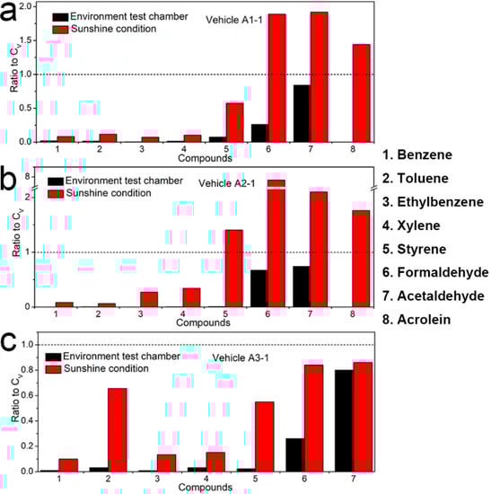 The ratios of concentrations of eight confirmed compounds measured inside (a) Vehicle A1-1, (b) Vehicle A2-1, (c) Vehicle A3-1 in the environment test chamber (CE) with sunny outdoor conditions (CS) to their corresponding limited values (CV) of the national standard GB/T 27630, respectively. The black short dash corresponds to a value of 1.