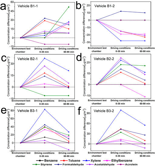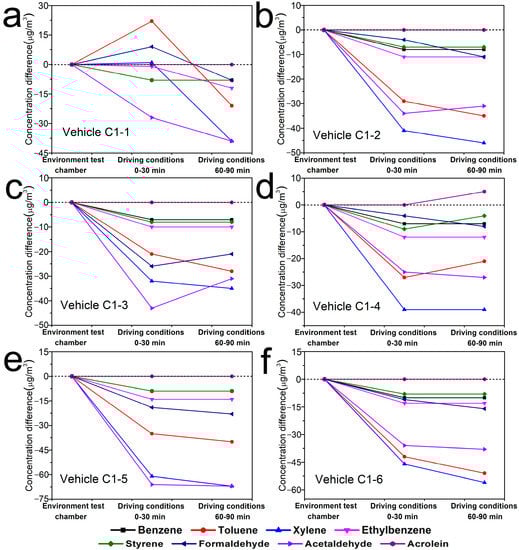 As the air conditioning mode inside the tested vehicles was adjusted to internal circulation, and the infiltration air flow through joints and leaks in vehicle envelopes was the predominant airflow that could affect pollutant transportation inside vehicle cabins [17,37]. Under driving conditions, the vehicles ran at a certain speed, which could accelerate the air exchange inside and outside vehicles. Therefore, the concentration changes of VOCs and TVOC inside the vehicles should be CE > CD(0–30min) > CD(60–90min) in theory, which was consistent with the results tested inside the vehicles of Brand C. But based on the test results of Brand B, except for some substances inside the vehicle B1-1 and B1-2, CD(0–30min) were generally higher than CE and CD(60–90min). That was because the six vehicles of Brand B were all parked and enclosed under direct sunlight (Table 1) before the experiments were carried out under driving conditions, which could accelerate volatilization of VOCs from vehicle interior trims due to the high temperature inside the vehicles. Therefore, it was reasonable that more pollutants were collected inside the vehicles of Brand B at the first 30 min under driving conditions than that in environment test chamber, even though the temperature was the same under these two conditions. However, although the vehicle C1-5 and C1-6 were also parked and enclosed under direct sunlight for 2 h before running on the vehicle proving ground, the CD(0–30min) of VOCs and TVOC were actually lower than their CE. That was because different vehicle brands have different air exchange rates. And the higher speed of the vehicles of Brand C than that of Brand B could lead to the increase of the air exchange rate inside and outside Brand C on one hand, while on the other hand, there might be (no air sampling) less pollutants emitted from the interior trims of Brand C than that of Brand B under direct sunlight, and then the concentration of pollutants inside Brand C would decrease rapidly at a higher air exchange rate.