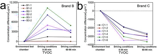 The difference in the types and boiling points of VOCs inside the vehicles of Brand B and C would also lead to the difference in the trend of TVOC concentration changes inside these vehicles in actual driving conditions. It would take a longer driving time to reduce the TVOC concentration inside these vehicles to a level that was consistent with or lower than that in the environment test chamber.