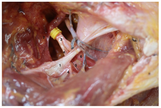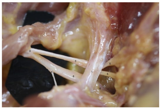 Anatomical variation on left shoulder from specimen C: different anatomical structures could be observed as follows: (1) superior transverse scapular ligament; (2) inferior belly of omohyoid muscle; (3) suprascapular nerve; (4) acromioclavicular sensitive branch; (5) supraspinatus motor branch; (6) infraspinatus motor branch; note that the division into supraspinatus and infraspinatus motor branches is proximal to superior transverse scapular ligament.