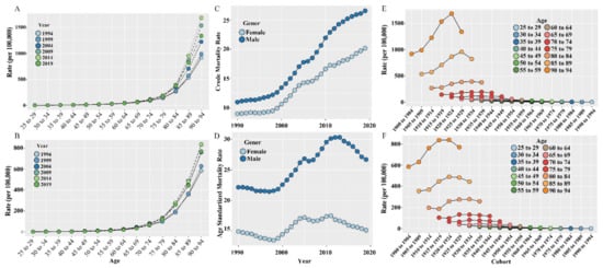 The long-term trend of ASMR (per 100,000) was presented in Figure 1D. As presented, the ASMR of males was higher than that of females for all time periods. Inconsistent long-term trends across periods can be observed for both genders in the CMR and ASMR.