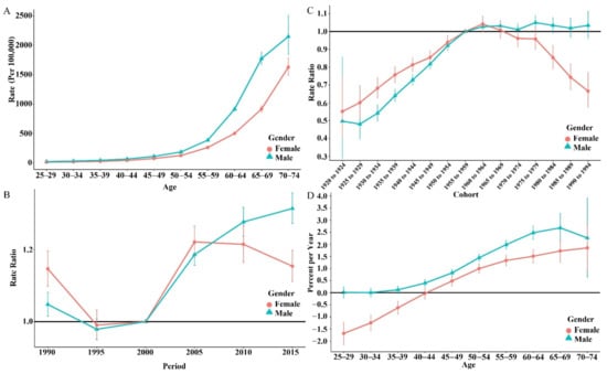 The cumulative health risks were estimated through an age-period-cohort (APC) model. To conduct the APC model, it was required for the included records to be converted to successive 5-year age groups and consecutive 5-year periods. The rate ratio (RR), local drift, net drift, and their corresponding 95% CIs were estimated. The APC model was conducted with the APC Web Tool (https://analysistools.nci.nih.gov/apc/, accessed on 23 March 2022) [].