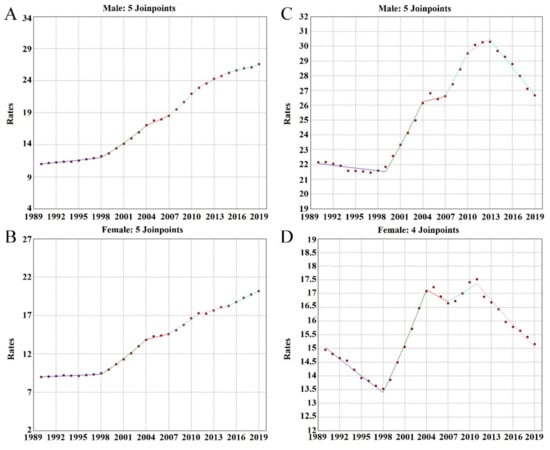 For the CMR, as shown in Table 1 and Figure 3A,B, the increasing trend of the CMR can be divided into six segments for both genders and the whole population. The general trends for males and females were approximately the same, as the APC for males was 3.1% and 3.0% for females from 1990 to 2019. As shown in Table 1, the increasing trend has slowed down. The peak existed in the time period from 1998 to 2004 for both males by 6.0% (95% CI: 5.6~6.3%; p < 0.001) per year, and for females by 6.8% (95% CI: 6.7~7.1%; p < 0.001) per year, then decreased gradually for both genders.