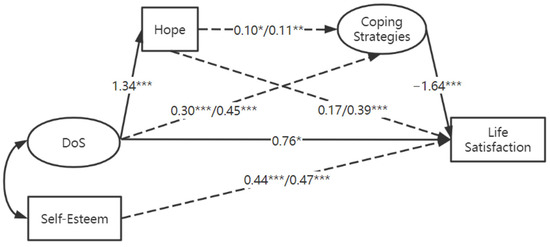 Bootstrapping estimation showed that the mediation effect of coping strategies on the association between DoS and life satisfaction was significant for the maltreated group (95% CI: (−1.21, −0.07)) and the comparison group (95% CI: (−1.45, −0.14)). The mediation effect of hope was significant among the comparison group (95% CI: (0.28, 0.81)) but was insignificant among the maltreated group (95% CI: (−0.01, 0.46)). There was also a significant chain mediation through hope and coping among the non-maltreated group (95% CI: (−0.79, −0.02)).