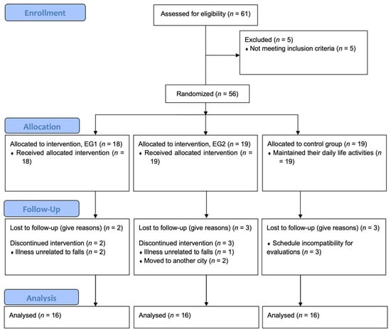 The sample size was calculated using the online G*Power software, considering an effect size = 0.25 [], alpha = 0.05, and statistical power of 95%. Hence, a minimum sample size of 45 participants was determined (15 participants for each group) to identify significant changes. The number of participants was increased to cover an expectable dropout rate. Thus, 61 community-dwelling Portuguese older adults were enrolled via verbal invitation and leaflets placed in community settings such as senior associations, recreation centers, and city halls.