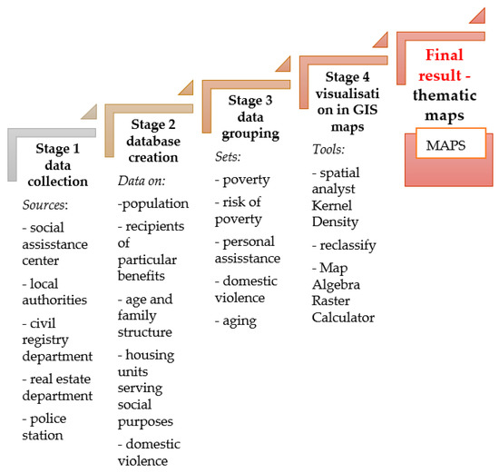 The following research hypothesis was formulated to address the above concerns: SACs require technical support, and the quality of social services can be improved by providing SACs with Geographic Information System (GIS) tools for mapping and visualizing the geographic distribution of potential welfare recipients. The main aim of this study was to propose an original GIS-based method for supporting SAC operations. A GIS-based multicriteria decision analysis was performed to map the geographic distribution and concentration of crisis events that should be addressed by social workers. The analysis relied on five sets of criteria to identify specific social problems. Five groups of negative social phenomena were identified based on a review of the literature and empirical research: (1) poverty, (2) risk of poverty, (3) personal assistance from social workers, (4) aging, and (5) domestic violence. The applicability of the proposed method was tested on the example of an SAC in a municipality, which is the smallest unit of administrative division in Poland. Data for the study were obtained from publicly available statistical datasets, the respective departments of municipal offices, SACs, and police stations. The names of the investigated towns and villages were coded to prevent stigmatization. The proposed method is universal and can be applied in all types of territorial units. The presented GIS tools are flexible and can be easily adapted to the needs of other countries by incorporating country-specific welfare data in the analysis. Data can be shared and analyzed using the Infrastructure for Spatial Information in the European Community INSPIRE [12]. In addition to quantitative attributes, such databases should also contain comprehensive spatial information because in the era of globalization, the creation of databases should be standardized [13].