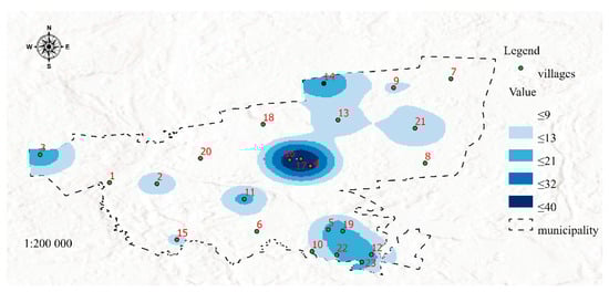 Figure 3 was developed in the GIS environment using Map Algebra with the Raster Calculator tool based on the distribution of features 1, 2, 3, 4, 5, 6, 7, 8, 9, 10, 11, 12, 13, 14, 15, 16, 17, 18, 19, 20, 21, and 22 (Table 1) determined with the use of the Kernel Density method. The resulting map visualizes poverty areas (SP 1, Table 1). An analysis of Map 1 indicates that the highest number of individuals entitled to income support reside in welfare districts covering towns and villages with code numbers 4, 16, and 17, as well as 3, 5, 12, 14, 19, 22, and 23. The resulting information can be useful in managing social assistance services, monitoring the operations of social workers and providing them with support in the process of planning trips to areas inhabited by recipients of income support payments. The future risk of poverty is presented in Map 2 (Figure 4).