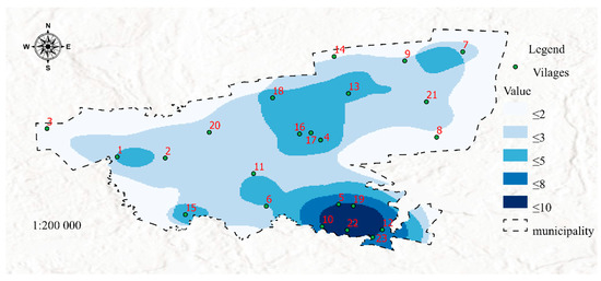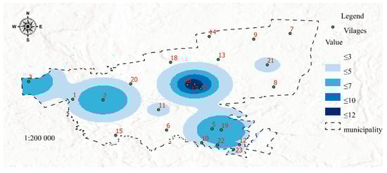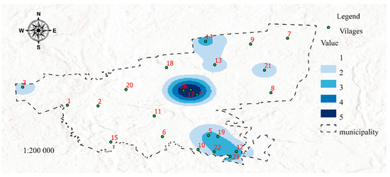 Figure 7 was developed in the GIS environment using Map Algebra with the Raster Calculator tool by overlaying the distribution of features 26 and 27 (Table 1) determined by the Kernel Density method. The resulting map visualizes Aging (SP 5, Table 1). The age structure of welfare districts in a municipality should be regularly monitored to counteract these risks. Senior activity and wellness programs can be initiated in areas with a high age dependency ratio. According to the World Health Organization, active aging leads to better health and greater psychological and physical well-being [50].