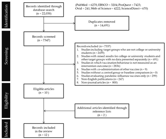 In addition, the following exclusion criteria governed which studies were not eligible for this systematic review: (1) studies including target groups who are not college or university students; (2) studies with mixed results for college or university students and other target groups, with no data presented separately; (3) studies in which vaccination behavior is not measured as an intervention outcome; (4) studies with co-administration of other vaccines; (5) studies without a control group or baseline comparison; (6) studies evaluating pandemic influenza vaccines only; (7) studies not published in English; or (8) studies not published in a peer-reviewed journal, thus grey literature was excluded from this paper. Articles that meet any one of the exclusion criteria were excluded immediately with no further inspection.