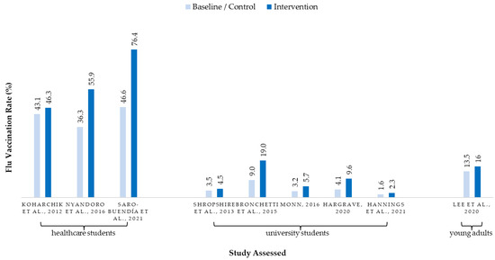 Seasonal flu vaccination rate (%) of included studies—intervention vs. baseline or control [16,42,43,45,47,48,50,51,52]. Remarks: Studies of Huang et al. [46], Roberto et al. [44], and Osborne et al. [49] are not shown on this chart as absolute vaccination rate was not provided in the literature.