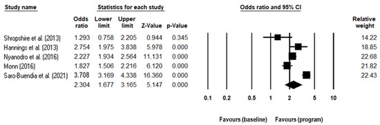 Statistical analyses of the impact of vaccination promotion programs on the vaccination rates reported in the included studies was conducted using Comprehensive Meta-Analysis version 3 [53]. Seven studies were not included in the meta-analysis because sample sizes or absolute vaccination rate are unavailable. Five studies [43,48,50,51,52] were included in the meta-analysis and the effect size representing the impact of the vaccination program is shown in Figure 3. The lower limit and upper limit indicate the 95% confidence interval. The size of squares in the forest plot of Figure 3 reflects the weight of the study according to the sample size. An odds ratio of 1.0 means that the vaccination rate was unchanged. While an odds ratio larger than 1.0 means that the vaccination rate was higher in the promotion group. The treatment effect was consistent across all studies included in the meta-analysis. All studies included in the meta-analysis had statistically significant effects in improving influenza vaccination behavior except for the study performed by Shropshire et al. [43]. The confidence interval of Shropshire et al.’s [43] study is wider than the others, reflecting that this study has lower precision. The p-value of Shropshire et al.’s study is 0.345 (p > 0.05) and does include the null value, indicating that the outcome of the study is not statistically significant. The effect was strongest (most distant from 1.0) in the program conducted by Saro-Buendía et al. [52] which used four out of eight social marketing benchmarks and a full 4Ps marketing mix in program design (OR = 3.71; CI: 3.17–4.34). Nyanodro et al.’s study [51] used five social marketing benchmarks and the full marketing mix (OR = 2.28; CI: 1.93–2.56). Hannings et al. [48] (OR = 2.75; CI: 1.98–3.84) and Monn [50] (OR = 1.83; CI: 1.51–2.22) also employed a full marketing mix in program design and significantly increased uptake of influenza vaccine. The pooled estimate represented by a diamond in Figure 3 shows that there is statistical significance at the meta-analysis level (Z = 5.147, p < 0.001). Influenza intervention program is better than control as the overall effect estimate, and its 95% confidence intervals are to the right of the line of no effect.