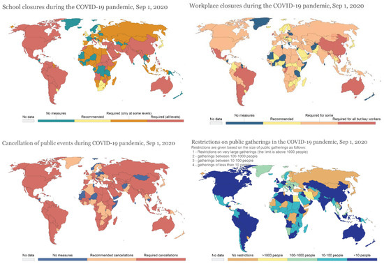 Global overview of the eight lockdown policies in the pre-vaccine era (1 September 2020) (Source: https://ourworldindata.org/policy-responses-covid, accessed on 15 January 2022).