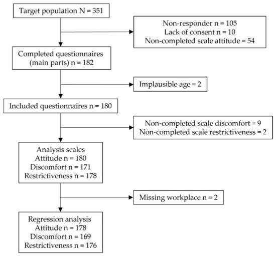 A total of 351 nursing staff were invited to participate in the survey. Of these, 182 completed the survey, including all items of the general Attitude scale. Two participants gave implausible information about their age (−1 and 1); hence, these cases were excluded. Thus, 180 questionnaires could be included in the analysis, corresponding to a participation rate of 51.3%. There were further missing responses in both the Discomfort (n = 9) and Restrictiveness scales (n = 2) (Figure 1).