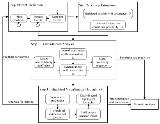The CIA-ISM method for scenario construction, impact analysis, and consequence prediction is presented in this section. As shown in Figure 1, the process of CIA-ISM includes four steps: event identification, group estimation, cross-impact analysis, and graphical visualization through ISM.