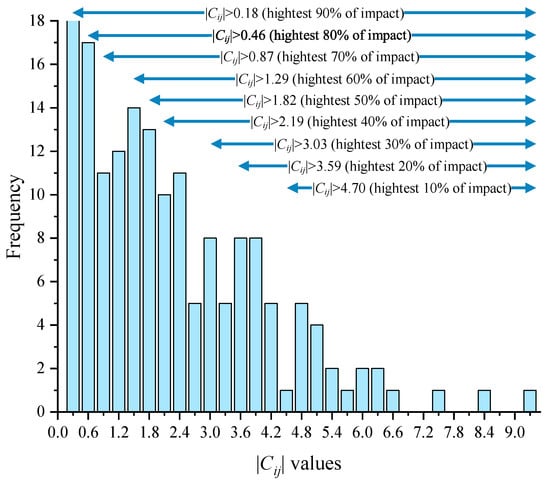 After the internal cross-impact coefficient matrix was calculated, ISM was used to draw the directed topology hierarchy based on the Step 4 “Graphical Visualization Through ISM” in Section 2. The scenario directed graph generated by ISM can show the direction and degree of impact between events. By choosing different intercepts to observe changes in the logic of event occurrence, we can deepen our understanding of the degree of mutual influence between events and the links between events. This process aims to select an appropriate value as the threshold intercept for generating the scenario. The distribution of is plotted as a histogram in Figure 3. If is selected as the threshold intercept for ISM modeling, the ISM directed topological hierarchy diagram will contain the highest 10% of internal cross-impacts. The COVID-19 emergency management scenario maps generated by ISM can reflect the direction and degree of impacts between selected events.
