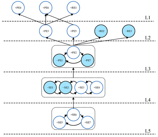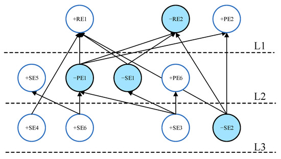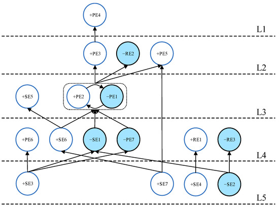 The reachable set and prior set can show an interrelationship between the events but cannot visualize the hierarchy where the events are located. Therefore, cause priority hierarchy extraction from the three element sets is required to establish the event layer [23]. According to the reasoning priority topology hierarchy extraction rule, when , the event is removed and placed at the bottom of the hierarchy. According to the order of sampling, the hierarchical relationship between events can be derived.