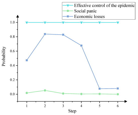 We performed scenario deduction analysis according to the condition settings summarized in Table 15. By applying Equation (5), the new occurrence probabilities of other events in each step of the scenario can be predicted, as shown in Table 16. The variation trend for the occurrence probabilities of the three resultant events is shown in Figure 8.