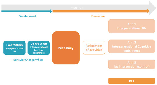 An overview and timeline of the program development and evaluation is presented in Figure 1. First, to develop the intergenerational program, co-creation will be used in combination with a theoretical framework, the Behaviour Change Wheel [37]. Two co-creation trajectories will be followed: one that focuses on the development of a movement program for grandchildren and grandparents, and one that focuses on the cognitive enrichment of the latter movement program. Once both co-creation trajectories are finalized, a pilot study will be carried out to evaluate the feasibility and attractiveness of the intergenerational movement program in the target group (i.e., grandchildren and grandparents). These results will be used to further refine the program. Finally, an RCT will be conducted to measure the effects of the intergenerational movement program on the outcomes of PA, cognitive functioning, psychosocial well-being, and quality of the family relationship. The RCT will consist of two intervention groups (Arm 1: Intergenerational PA and Arm 2: Intergenerational Cognitive Enrichment) and one control group (no intervention).