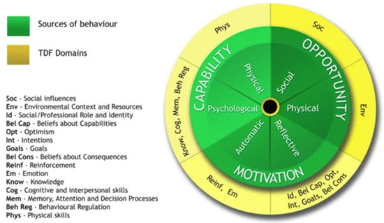 The three sources of behaviour and the TDF Domains of the Behaviour Change Wheel. “Adapted with permission from [47]. 2017, Lou Atkins”.