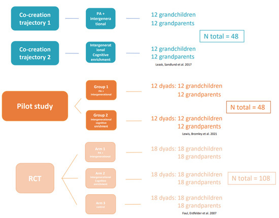 After the two co-creation trajectories are finalized, a pilot study will be conducted to determine whether the two different programs are attractive, feasible, and fun for grandchildren and grandparents (see Figure 1). The purpose of this portion of the study will be to finetune the programs and recruitment strategies to optimize the RCT. There will be 2 groups of 12 dyads. Group 1 will engage in the intergenerational PA program, while Group 2 will engage in the cognitively enriched intergenerational PA program. Each session will be led by researchers and facilitators (with a background in movement and sports sciences and/or health promotion research). All the sessions will take place in Ghent (i.e., where the main researchers are based); the exact location will depend on the preferences of the participants and what is practically feasible.