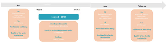 | 3. | Materials: All the variables (physical activity, cognitive functioning, psychosocial well-being and quality of the family relationship) will be measured pre (at baseline, before the start of the sessions), post (after 24 weeks, right after the RCT ends), and for the third period at follow-up (after 36 weeks). To objectively measure physical activity, grandchildren and grandparents will have to wear Axivity AX3 accelerometers (wrist of the non-dominant hand) or ActiGraph wGT3X-BT (right hip). Grandparents and grandchildren also have to wear these accelerometers during certain sessions to measure the intensity of the activities that they do together. A seven-day diary will be used to study the context of co-PA. Cognitive functioning will be objectively quantified with the validated neuropsychological test battery (i.e., CANTAB) (cambridgecognition.com) using an iPad 10.2. Psychosocial well-being will be measured by several questionnaires that administer well-being indicators relevant for children and older adults. For children: PEDs-QL (Pediatric health-related Quality of Life scale). For older adults: Warwick-Edinburgh Mental Well-Being Scale (WEMWBS), Four-Dimensional Symptom Questionnaire (4DSQ), Social and Emotional Loneliness scale for Adults (SELSA). Quality of the family relationship will be measured in children with the Grandparent-grandchild Relationship Questionnaire. For older adults, this will be measured with a self-report questionnaire, based on previous investigations of Farneti & Battistelli. | pp. 16–17 | _____________ |