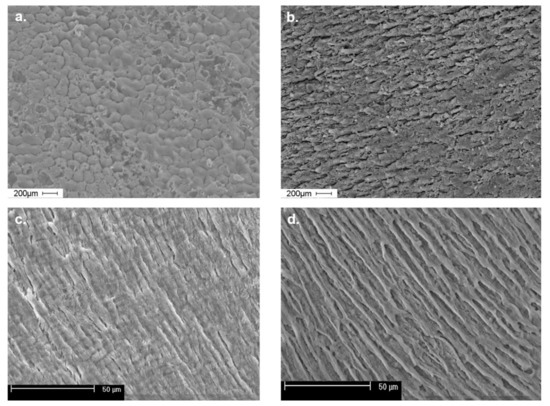 Scanning electron microscopy (SEM) imaging in a healthy and fluorotic tooth: (a) buccal enamel surface without fluorosis; (b) buccal enamel surface with fluorosis; (c) cross-section of enamel without fluorosis; (d) cross-section of enamel with fluorosis. Scale is shown in the left bottom corner of each image.
