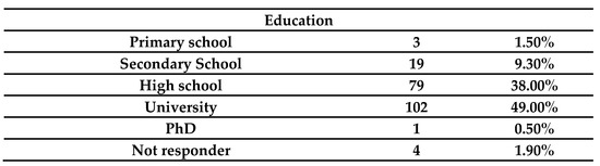 The sample analyzed consists of 208 statistical units: 154 women, 51 men and 3 people refused to specify their gender (Table 1). The mean age of the sample is about 44 years old, with a SD of 13.629. The youngest interviewed is 11 years old, while the oldest one is 77 years old. The median is 46 years old. Most of the sample have a university education (Figure 1). Most of the interviewees are from Italy and from Europe in general (Table 2).