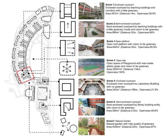 Spatial typologies offer direct guidance to designers for the regulation and improvement of environmental experiences. Research has already revealed spatial factors that have a relationship with restorative environments. These include street characteristics, the scale of squares, and the degree of enclosure. A number of spatial prototypes for schools have been documented, but they have not attracted much research attention, lack consideration of restorativeness, and do not provide design guidelines. Going outside is fundamental to the perception of outdoor spaces and for their restorative effects to have any impact, and research has suggested that the quality of restorative environments can affect the occurrence of outdoor physical activities at school [,] and students’ cognitive performance []. There is thus a mutual link between environmental preferences and their restorative quality. Previous research has focused on the restorative quality of the environment, but its actual use is considered independently. According to the theory of environmental behavior, behaviors are a direct result of environmental impact. The spatial distribution of behavior may therefore be affected by a range of spatial factors, including location, scale, and quality.