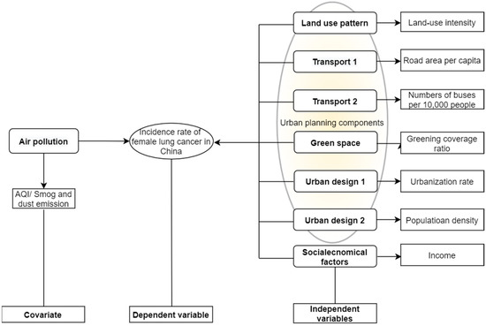 The analysis model relates to the theoretical framework in Table 1. To minimize the interference of individual behavioral factors on lung cancer, e.g., smoking and alcohol abuse, the incidence of lung cancer among Chinese women was set as the unique dependent variable. Land-use intensity (LUI), road area per capita and number of buses/10,000 persons (as one of the representations of public transportation accessibility) and greening coverage of the built-up area were selected as the independent variables corresponding to the categories of land-use pattern, transport and green space components. As we all know, urban design is somewhat a subjective variable. Urbanization rate and population density are substituted as more objective variables to avoid urban design’s subjective bias and fallacy. The air quality index (AQI), smog and dust emissions were selected to characterize air pollution variables (Figure 1).