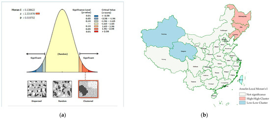 (a) Global Moran’s I calculation report. (b) Result of Anselin Local Moran’s I calculation.
